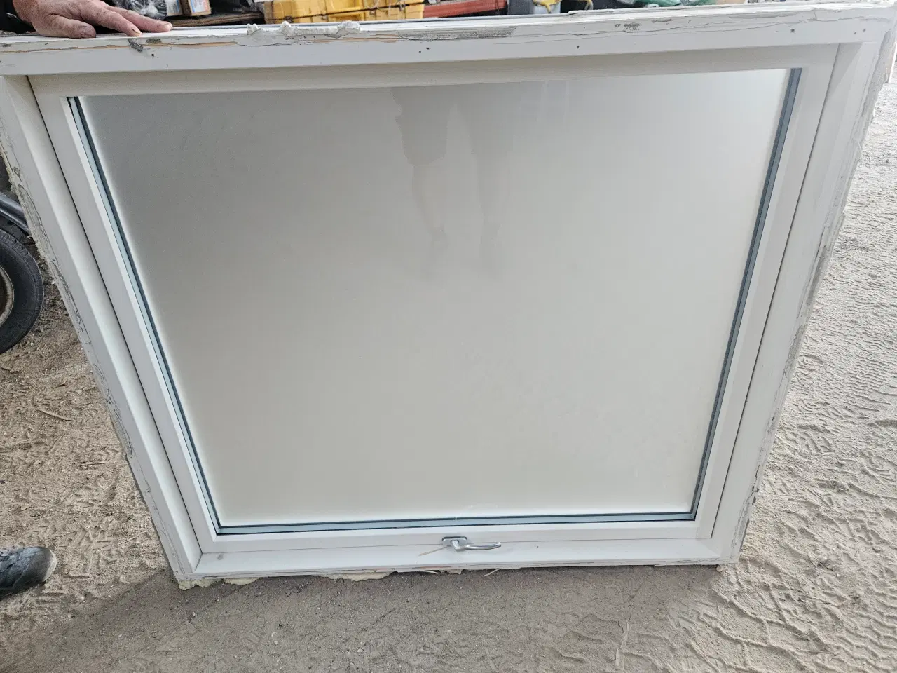 Topstyret træ-alu vindue med matteret glas. Hvid.