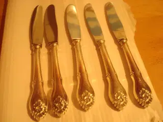 COLUMBINE middagsknive, VED KØB AF ALLE KNIVE SAMLET KR 1075. sølvplet, 2 sovseskeer, 2 kart.skeer, 2 stegegafler, kagespade mv. Pr kniv kr 99, pr serv.dele kr 85. Faste priser - utrolig flot stand.tlf 60183315