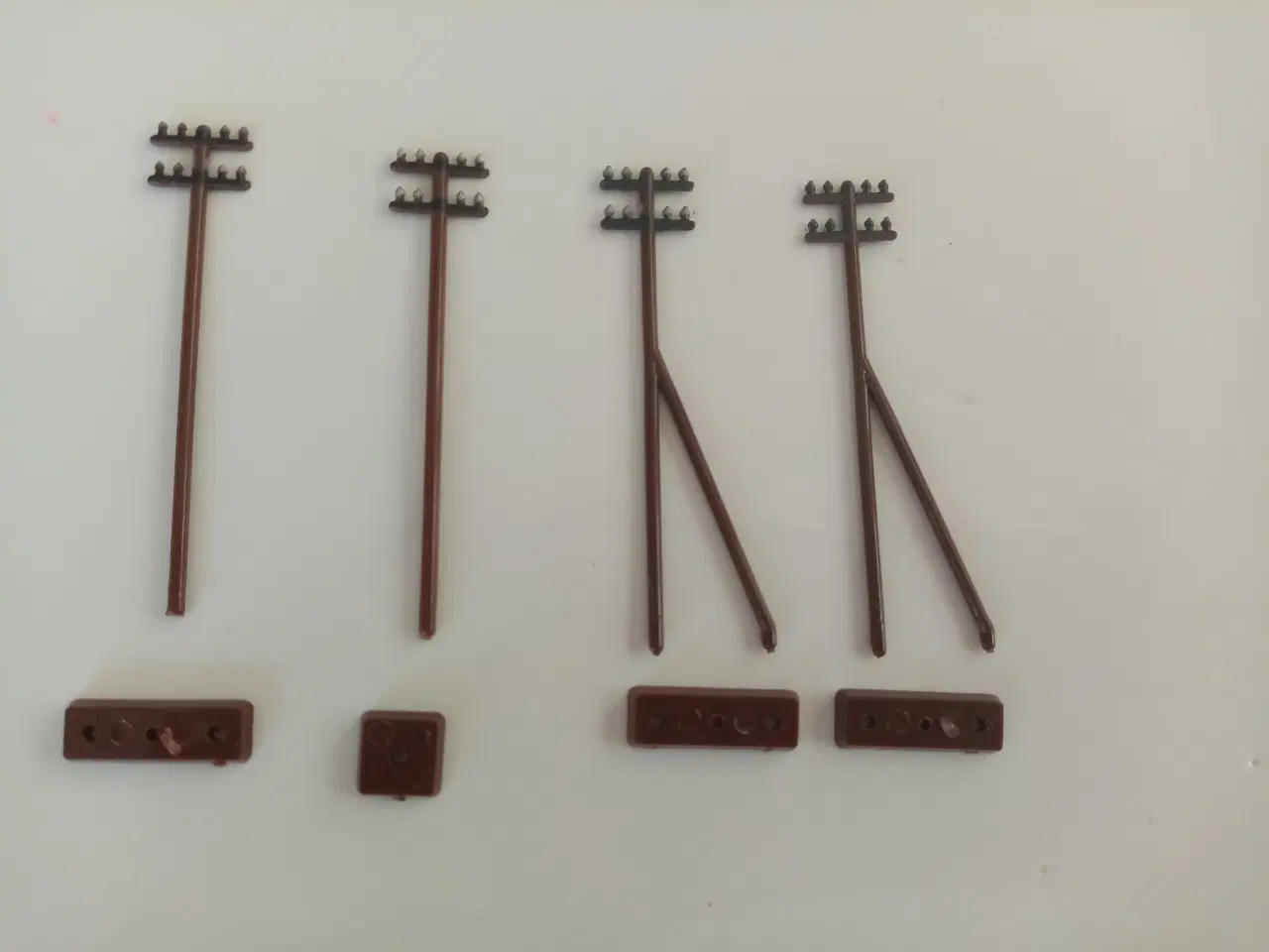 El eller telefonmaster til spor N. 35 stk, Ca. halvdelen med støttestang. Der er "fødder" som kan anvendes. Stod tidligere langs jernbaner og landeveje.