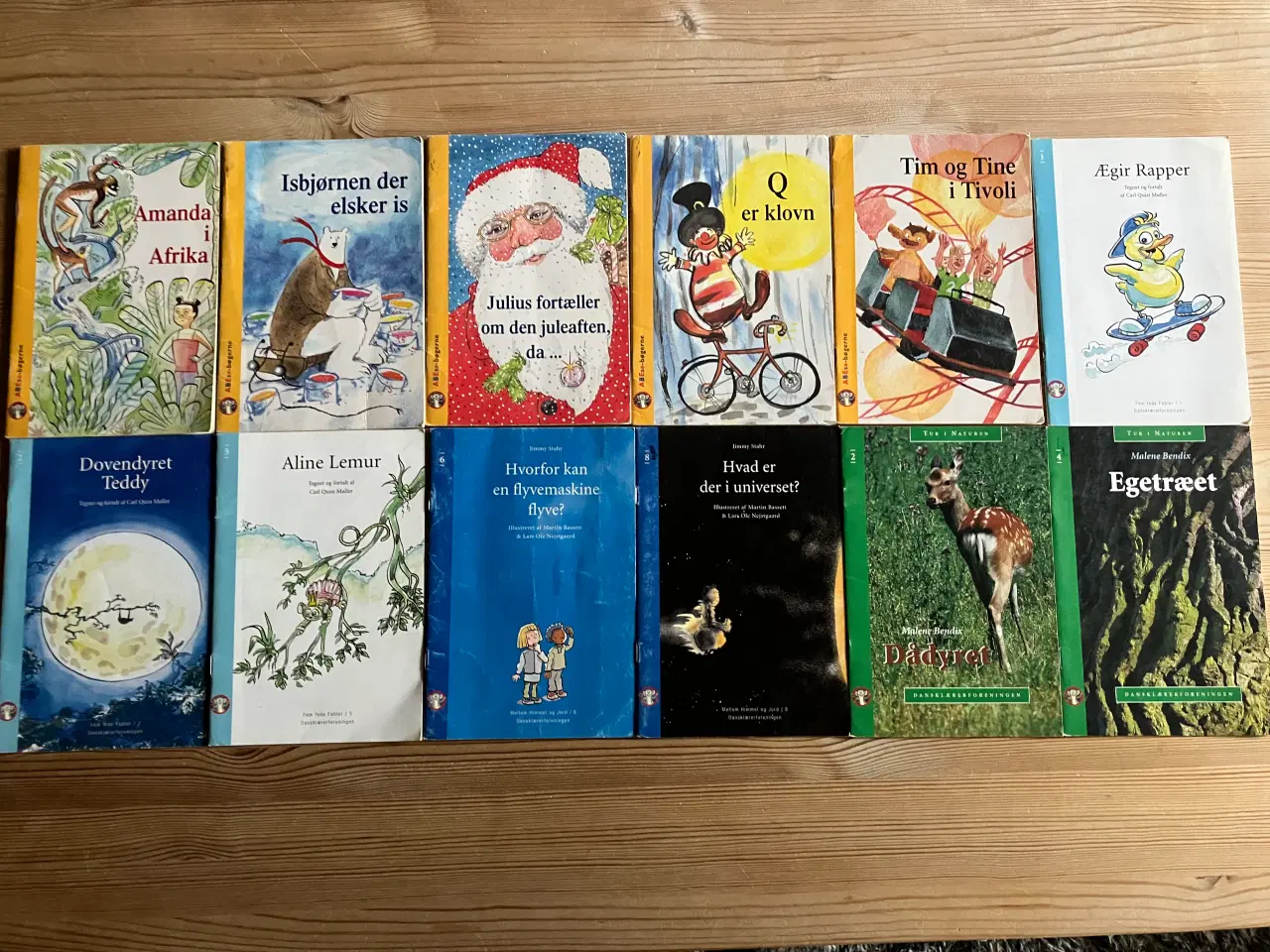 Dansklærerforeningen, 1999, 2000, 2001 og 2002, alle i paperback, illustreret og yderst velholdte. Der er følgende: Amanda i Afrika Isbjørnen der elsker is Julius fortæller om den juleaften, da ... Kat og konge Q er klovn Tim og Tine i Tivoli Tekst: Synnøve Lien og Kirsten Meldgaard Ægir Rapper Dovendyret Teddy Aline Lemur Tegnet og fortalt af Carl Quist Møller Hvorfor kan en flyvemaskine flyve? Hvad er der i universet? Tekst: Jimmy Stahr Dådyret Pindsvinet Egetræet Tekst: Malene Bendix Danskfidusens eventyr: Nr. 4: Den lille hvide kone Nr. 6. Ulven og de syv små gedekid Tekst: Synnøve Lien og Kirsten Meldgaard Pris 25 kr. pr. stk. Sendes gerne.