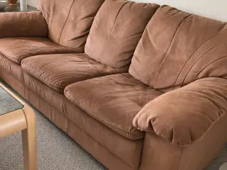 Nielaus tremmesofa med blå læderhynder. Den mindterste ryghynde er lidt skæv og har været det siden køb. Kontakt 2445 6113