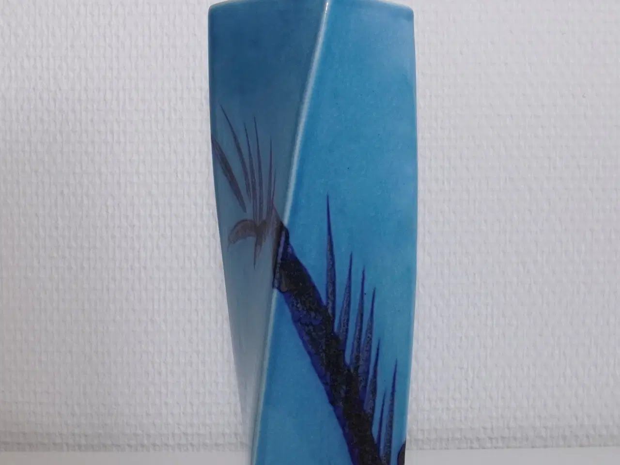 Speciel og smuk vase i porcelænsler af keramiker og designer Tue Poulsen. Vasen har et fint drej og er med turkis glasur med blå og sort dekor. Vasen er i flot og fejlfri stand - absolut ingen afslag, revner, ridser eller lignende. Vasen er 20,6 cm. høj. Vægt: 560 gram Vasen er signeret i bunden med: Tue – 1999 Tue Poulsen er født i 1939. Han er uddannet billedkunstner, designer og keramiker. Han startede i 1959 på Kunsthåndværkerskolen i København og i 1963 startede han sit eget keramiske værksted. Tue Poulsen har gennem årene vundet priser og udstillet sine værker en lang række steder. Mobilepay, kontanter og bankoverførsel modtages.