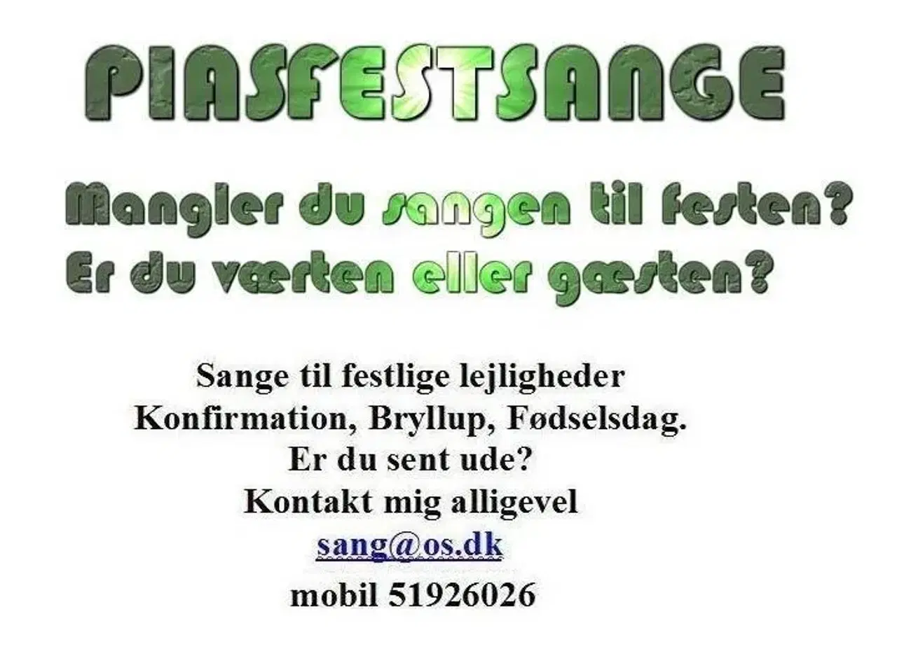 konfirmation, fødselsdag, bryllup Så er det igen sæson for konfirmationer og personlige festsange. Alt kan foregå over nettet og telefon. Prisen er 10 kr. pr. linie men max 50 kr. pr. vers og max 500 kr. ialt for en sang pænt sat op med billeder Prisen er inkl. PYNT der passer til lejligheden eller egne billeder. Jeg har skrevet sjove, glade, og positive festsange og taler i mange år, og det har jeg stadig en stor passion for. Jeg er åben for at rette i sangen efterfølgende. Der kan jo være noget,du opdager du har glemt eller noget du gerne vil have udtrykt på en lidt anden måde. Jeg pusler om de sidste detaljer med et smil. Det er jo dig der kan mærke om sangen rammer rigtigt Til konfirmation, fødselsdag, bryllup, sølv- eller guldbryllup, dåb, firmafest, svendegilde mm. skriver jeg med glæde en rigtig god festsang. Jeg skriver med kærlig humor. Stikord er en lille bitte beskrivelse af et emne. Hvert emne er et vers. Skriv dine stikord til: mobil: 51926026