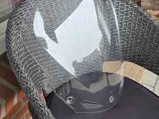 Det er denne model, nypris 1499 kr: https://www.thansen.dk/scooter-mc/styrthjelm/flip-up-hjelm/nex-racing-med-intercom-solvisir/styrthjelm-flip-up-nex-racing-h271-med-intercom-og-solbrille-str.-xl/n-244904791/pn-233708979 Inkl. et indre solvisir, som man kan klappe ned, når der er for meget sol. Der mangler en del i det indbyggede Bluetooth-headset, som derfor nok ikke virker