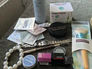 Lille Skønhedspakke. Kan købes samlet eller enkeltvis. Sender gerne, eller afhentes i Ishøj. - NEW: IN shaving gel men. 200 ml. Ny og uåbnet. - Tandex flexi mellemrumsbørster. 23 stk. - Perle øreringe- og armbånd. Ikke ægte perler. - Diverse prøver. Lancome foundation, filorca peel, gosh primer, pudderdåserne balsam og lancome serum. - Ecottols makeup pensel - O.N.E dameur. Skal have nyt batteri. - Lancome. eyeliner. Blond cendre 8307 11. Mælkechokolade brun - Beaute pacifique lip balm. pepper mint. 15 ml. - Max Factor. Turkis grøn øjebskygge. Nr 05