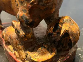 Sjælden forgyldt figur af barmhjertighedsgudinde ridende på den mytologiske Dragon King fisk Hjembragt fra Kina 1998. Str. h. 61 x br. 40 cm.