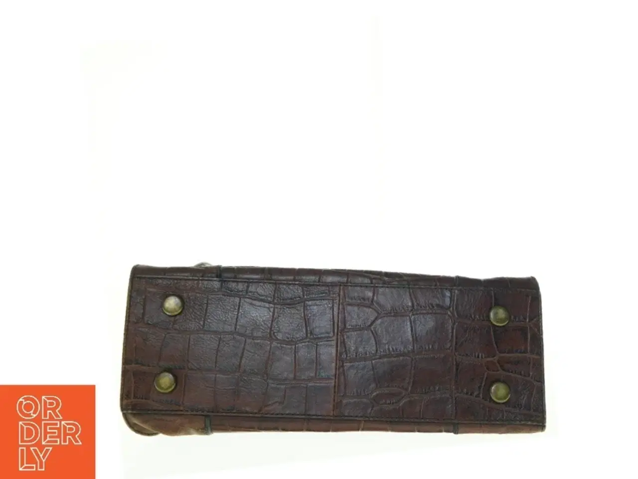 Klik på 'Se annoncen hos forhandleren' for at se varen i vores webshop Brun skuldertaske i præget læder med krokodillemønster. Tasken har en overflap med magnetisk lukning, justerbar skulderrem og flere låse detaljer. Den har også metalnitter på bunden for ekstra beskyttelse og en lynlåslomme bagpå. Brand: Fossil Farve: Brun Stand: 80 - Tasken har slid på kanter og overflader, hvilket stemmer med tidligere brug men er stadigvæk i god stand. Vi sender til hele landet for 49 kr. Leveringstiden er 1-3 hverdage. Du kan også gratis hente den på vores lager på Industrivej 10 i Slangerup. Er du i tvivl om varen stadig er til salg? Klik på knappen "Se annoncen hos forhandleren" for at se den i vores webshop. Kan du se den der, er den stadig til salg Orderly er en ny måde at købe brugt på. Vi har alle vores sælgeres ting på vores centrale lager. Derfor kan du være helt sikker på at få dine ting - og du kan samle flere ting på tværs af sælgere og kun betale én gang fragt.