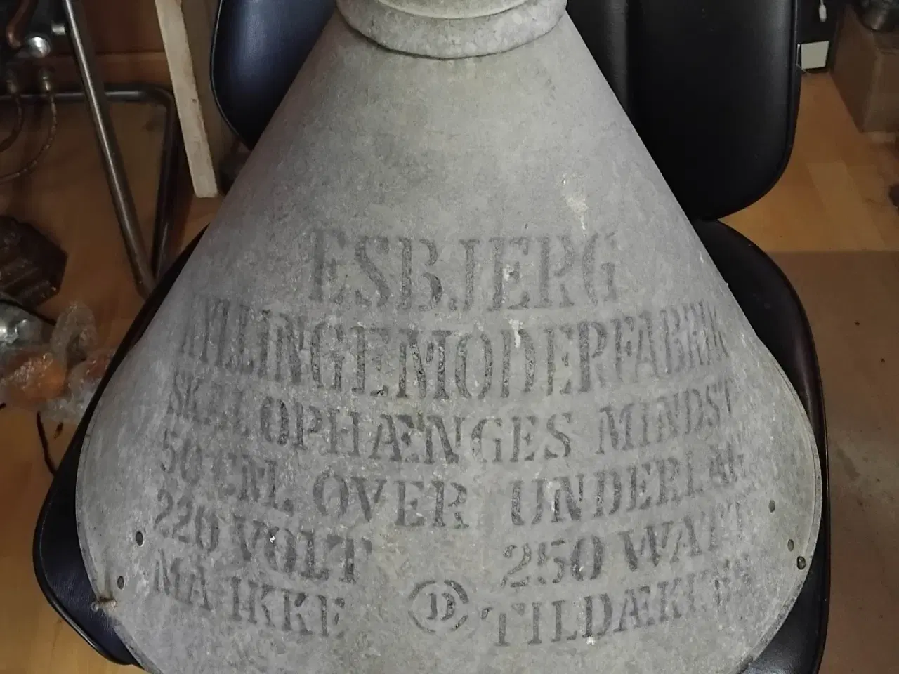 Rigtig flot retro lampe fra hønsefarm/fabrik med påskriften "Esbjerg Kyllingemoderfabrik" m.m. lavet i galvaniseret stål og med E27 fatning. Oprindelig en varmelampe fra et kyllingefabrik. Sælges for 500 Kr. afhentet. Højde 52 cm. og diameter 49 cm. Rimelig stor , så sendes ikke men skal afhentes.