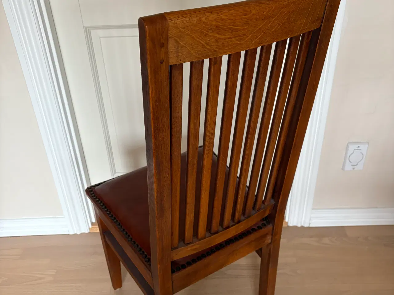 Unika håndlavet i DK Massiv egetræ, som er bejdset for at få antik old look, fra røgfrit hjem. Der medfølger 2 tillægsplader a 50 cm, som nemt skubbes ind i hver ende. Bord meget tungt Total længde bordplade 3,7 meter Bordpladen har lettere brugsmærker, men kan nemt fixes. Sæder ægte læder. Meget flot stand. Nypris 38.000,- Se mine andre annoncer med mørke møbler.