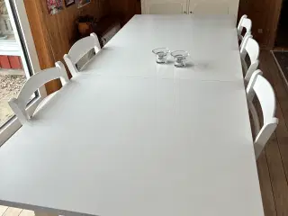 Flot stort massivt egetræs spisebord, m/ 2 udtræksplader og 8 stole. Hvidt sæbebehandlet og fremstår som nyt - har ikke været brugt i hverdagen. Længde 220cm - bredde 100 cm -- tillægsplader 2 x 65 cm - højde 76 cm -- bordet kan bliver 350 cm langt --- sælges samlet --- prisen er afhentningspris