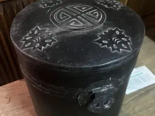 Lille lakboks str. br 10 x 4 x 7 cm. ---- Lakudskæring på boks af kejserens vogn fundet i graven med terracotta soldaterne i Xian