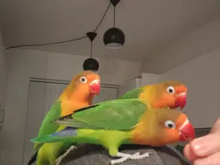 Dværgpapegøje Agapornis Fisheri, avlspar fra 2022 og 2024, søger nyt hjem. Størrelse ca 13 cm, voksen, er en nem fugl, livlig, nysgerrig, skal holdes parvis (nem til at få til at yngle). Jeg har 2 avlspar tilovers, fastringet og hvis du har brug for det får du en grundig instruktion af mig. Kun seriøse henvendelser.