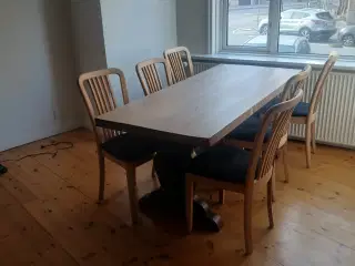 Velholdt spisebord med stålben incl. 6 stole og incl. . 2 tillægsplader a 50 cm. Længde 160 cm ( med 1 plade) - længde 210 med 2 plader: Bordets mål: Højde: 72 cm Bredde: 110 Længde med 1 plade: 160 cm.