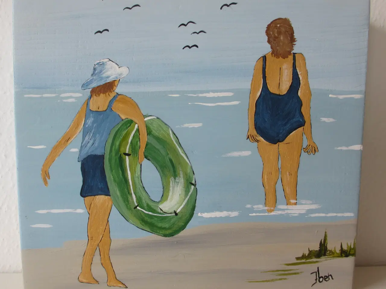 Acryl-maleri på træklods, str. 19 x 17 x 4 cm, malet på alle flader. Kan stå i vindue, på bord, skab, skænk, i reol eller lignende, og vendes efter behag ! Motiv: BADEDAMER / STRANDHUS Excl. fragt kr. 47,00 med GLS Instagram: malerier.iben