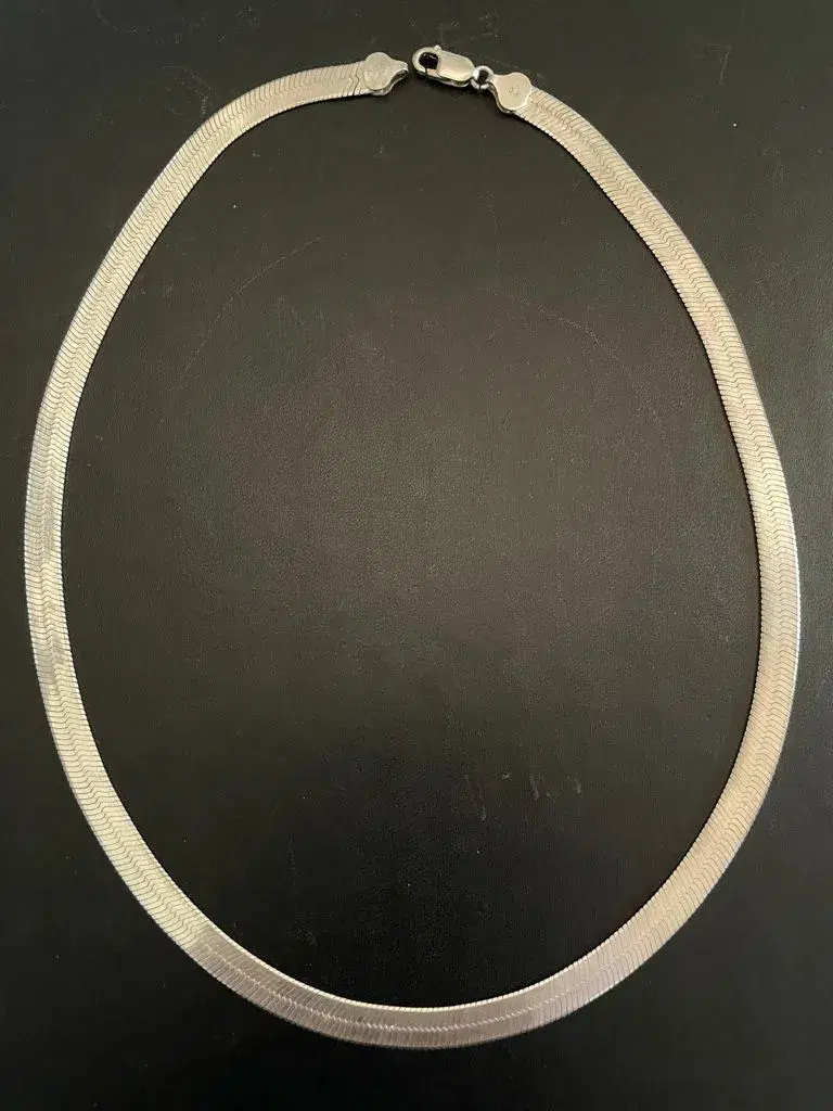 Flot 925 sølv Herringbone halskæde sælgers. Mål: Længde 51 cm. Bredde 7 mm. vægt 25 g. Materiale: 925 sølv. Mærke: Made in Italy. Flot kæde i massivt 925 sterlingsølv, med div. ægthedsstempler. Ny, men skal pudses op, da den har ligge ubrugt hen i en del år. Kæden er dog meget nem at pudse op, hvis man ikke ønsker det matte look den har nu. Pris kr. 800,- + evt. GLS forsendelse kr. 42,-