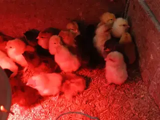 Skrukhøne med 6 daggamle kyllinger fra økolandbrug søger nyt hjem.