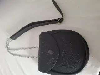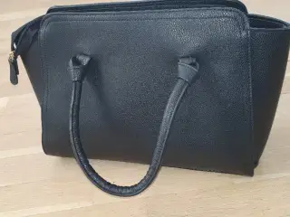 Fejlkøb, blå håndtaske med skulderrem og tre lynlåsrem indvendig i foret.Størrelse: 26 cm. lang, 25 cm høj og 12 cm. bred tasken er ikke skind, men er lavet i et holdbart skindlignede materiale. Er solid og nem at holde. Skal brae tørres af med en fugtig klud, hvis der kommer en plet på den.