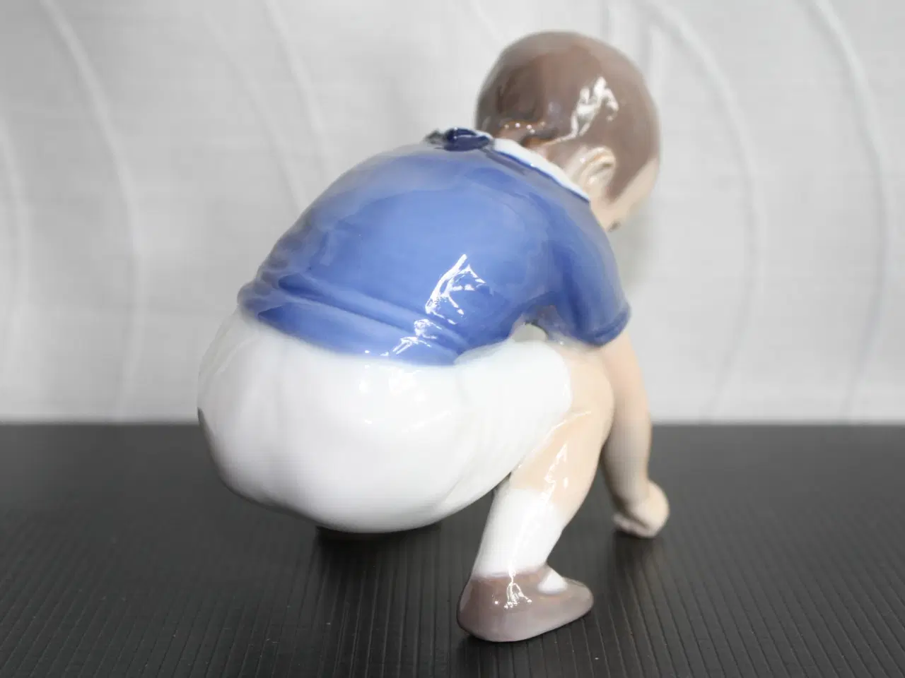 Dickie, Dreng,der sidder på hug, Figur fra Bing & Grøndahl figur nr. 1636 Højde 9 cm Bredde 10 cm Designet af Ingeborg Plockross Irminger 30
