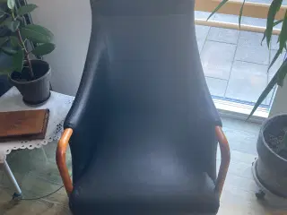 Lænestol i sort skind. Fremstillet hos Hurup Møbler. Kvittering haves.