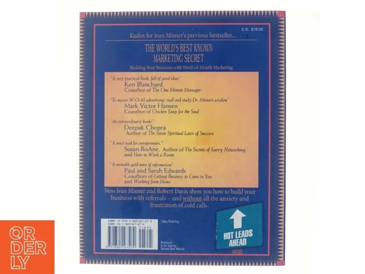 Klik på 'Se annoncen hos forhandleren' for at se varen i vores webshop A Sure-fire Way to Generate New Business No more cold calls! Forfatter: Ivan R. Misner, Robert Davis Dr. Ivan Misner is the Founder and Chief Visionary Officer of BNI, the world's largest business networking organization. BNI was founded in 1985. The organization has thousands of chapters throughout every populated continent of the world. Each year, BNI generates millions of referrals resulting in billions of U.S. dollars worth of business for its members. Dr. Misner's Ph.D. is from the University of Southern California. He has written over 24 books, including many Amazon and New York Times Bestsellers. He is a monthly columnist for Entrepreneur.com and has taught business management and social capital courses at several universities throughout the United States. Called the "Father of Modern Networking" by CNN and the "Networking Guru" by Entrepreneur magazine, Dr. Misner is considered to be one of the world's leading experts on business networking and has been a keynote speaker for major corporations and associations throughout the world. He has been featured in the L.A. Times, Wall Street Journal, and New York. Times, as well as numerous TV and radio shows including CNN, CNBC, and the BBC in London. Dr. Misner has been named "Humanitarian of the Year" by the Red Cross and was awarded the John C. Maxwell Award for Leadership. In his spare time!!! he is also an amateur magician and a black belt in karate. Udgivelsesår: 1998 Sprog: Engelsk salg Brand: Ukendt Farve: Ukendt Stand: 60 - Vi sender til hele landet for 49 kr. Leveringstiden er 1-3 hverdage. Du kan også gratis hente den på vores lager på Industrivej 10 i Slangerup. Er du i tvivl om varen stadig er til salg? Klik på knappen "Se annoncen hos forhandleren" for at se den i vores webshop. Kan du se den der, er den stadig til salg Orderly er en ny måde at købe brugt på. Vi har alle vores sælgeres ting på vores centrale lager. Derfor kan du være helt sikker på at få dine ting - og du kan samle flere ting på tværs af sælgere og kun betale én gang fragt.