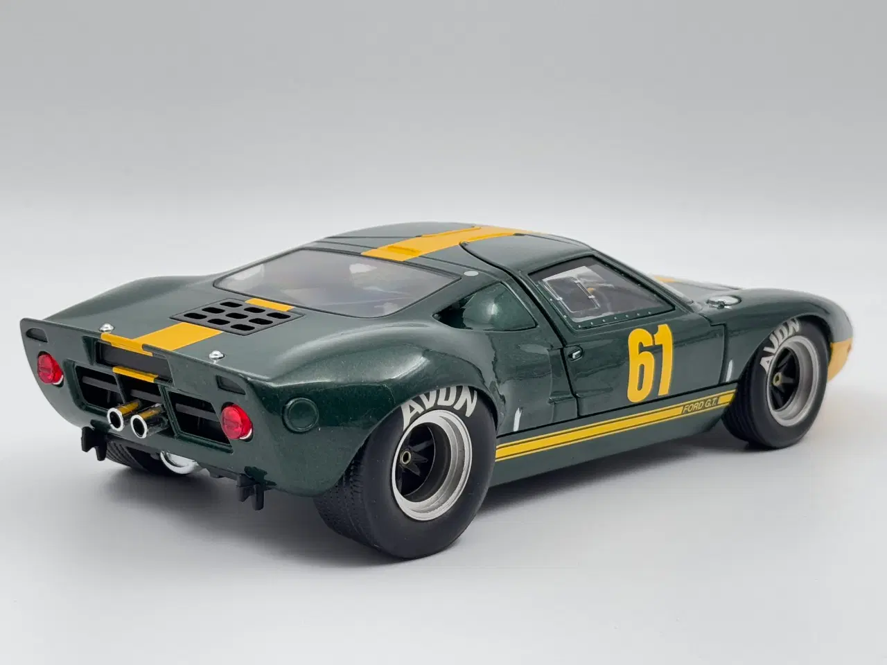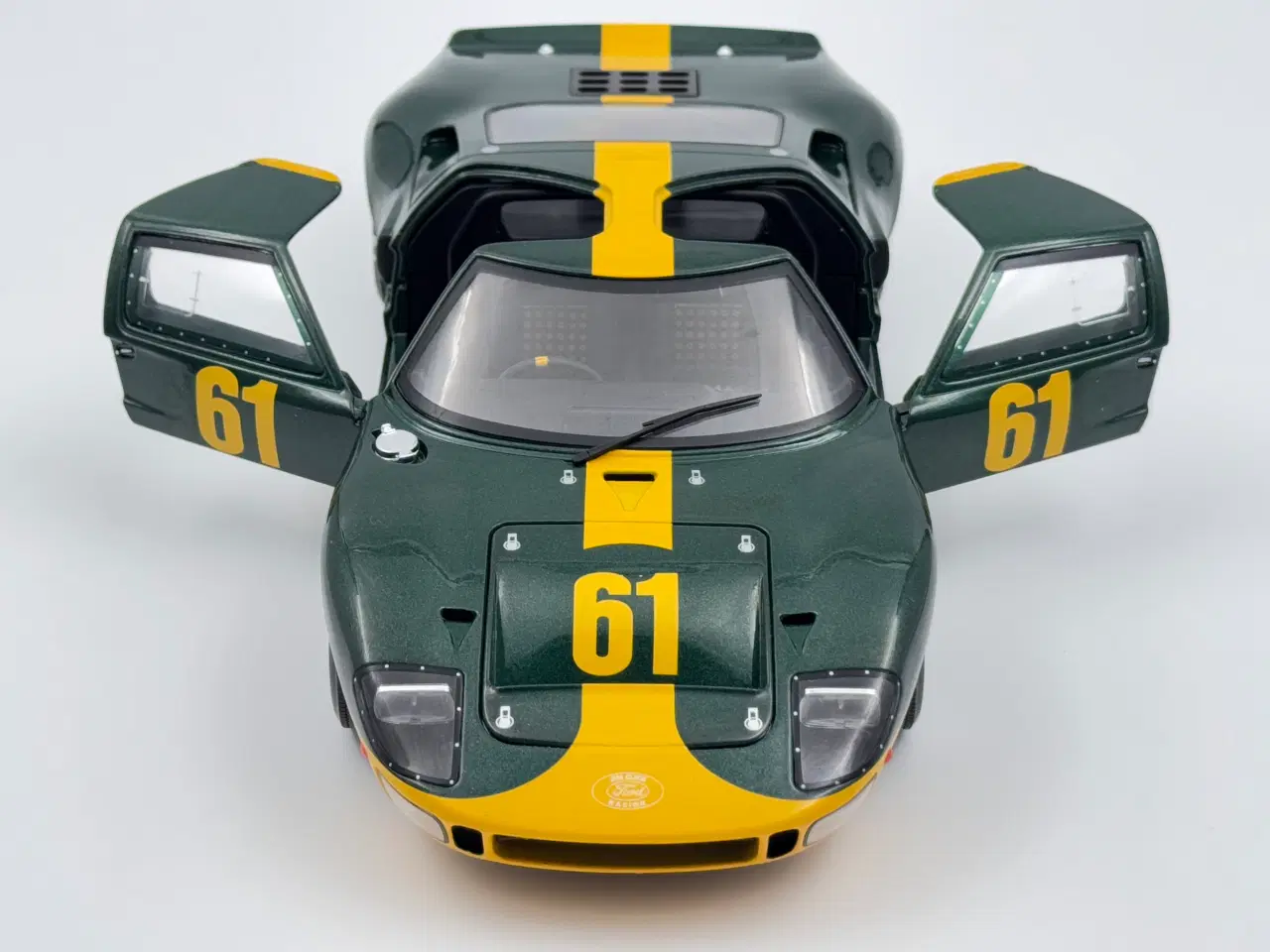 1966 Ford GT40 Mk1 Widebody 1:18 Jim Clark Performance Edition - Super sjælden, flot og detaljeret model bla. med MOMO rat - start nr 61 Farve: British Racing Green / Yellow lines Fremstår ny i original kasse Scala: 1/18 Producent: Solido Item number: S1803004 EAN 7427249076550 Se også mine andre modelbiler tilsalg her på siden AUTOart - Kyosho - Exoto - HotWheels - NOREV - Minichamps - Le Mans - LeMans - US - Amerikaner - GT-40 GT 40 Kan sendes for 59,- med tracking ...ved køb af flere betales fragten kun én gang. Jeg kan levere uden mer pris langs E45 motorvejen fra Aalborg til Kolding