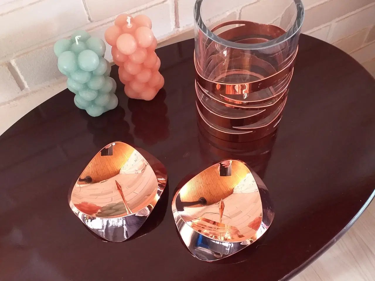 Vase og lysestager fra Stelton. Steltons Tangle vase har et dekorativt bånd udført i copper, der smyger sig om glasset i en uforudsigelig indbyrdes orden. Uanset vinklen du ser vasen fra, er båndet dynamisk og giver et varmt udtryk. Pris 225 Dkk. 2 stk. Papilio Uno lysestage i copper. Pris per stk. 100 Dkk. Samlet pris vase + 2 lysestage - 400 Dkk. Kan sendes. ( MobilPay muligt )