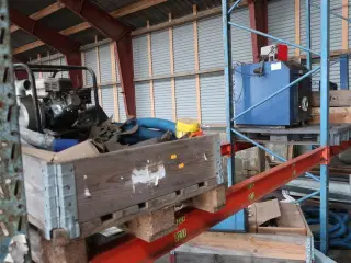 Reol med div. Reservedele og varelager samt rullevogn med indhold m.m.
