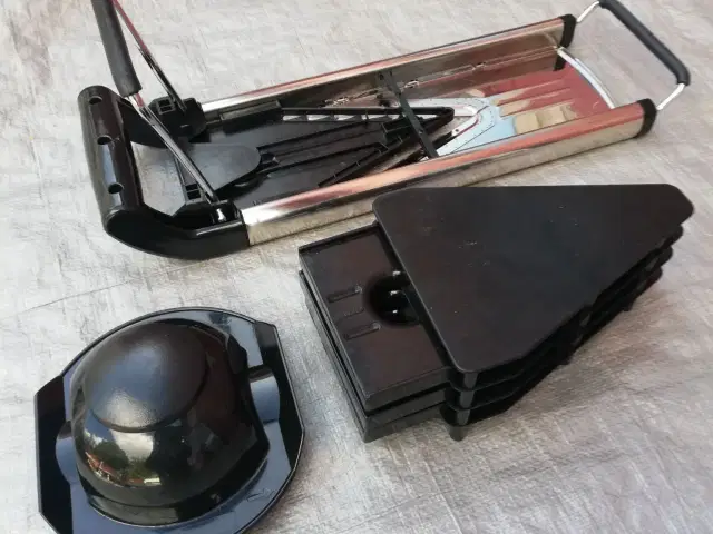 Med 4 skær og opbevaringsholder. Fremstillet i rustfrit stål. 45cm. 2 snitteplader til 2 tykkelser 2 julienneplader til strimler. Har håndtag og skridsikre fødder. Aldrig brugt. Vsk