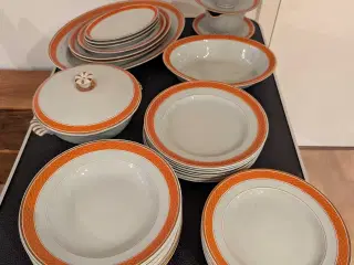 Middagsstel 14 flade spisetallerkner 8 dybe små tallerkener 1 sovseskål 2 kartoffel skål og 1 låg 1 stort stegefad 2 mindre fade 2 små fade 12 store dybe tallerkener 11 desserttallerkner