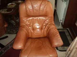 Sort læderstol med skammel. 1 år gammel . ER I ESBJERG
