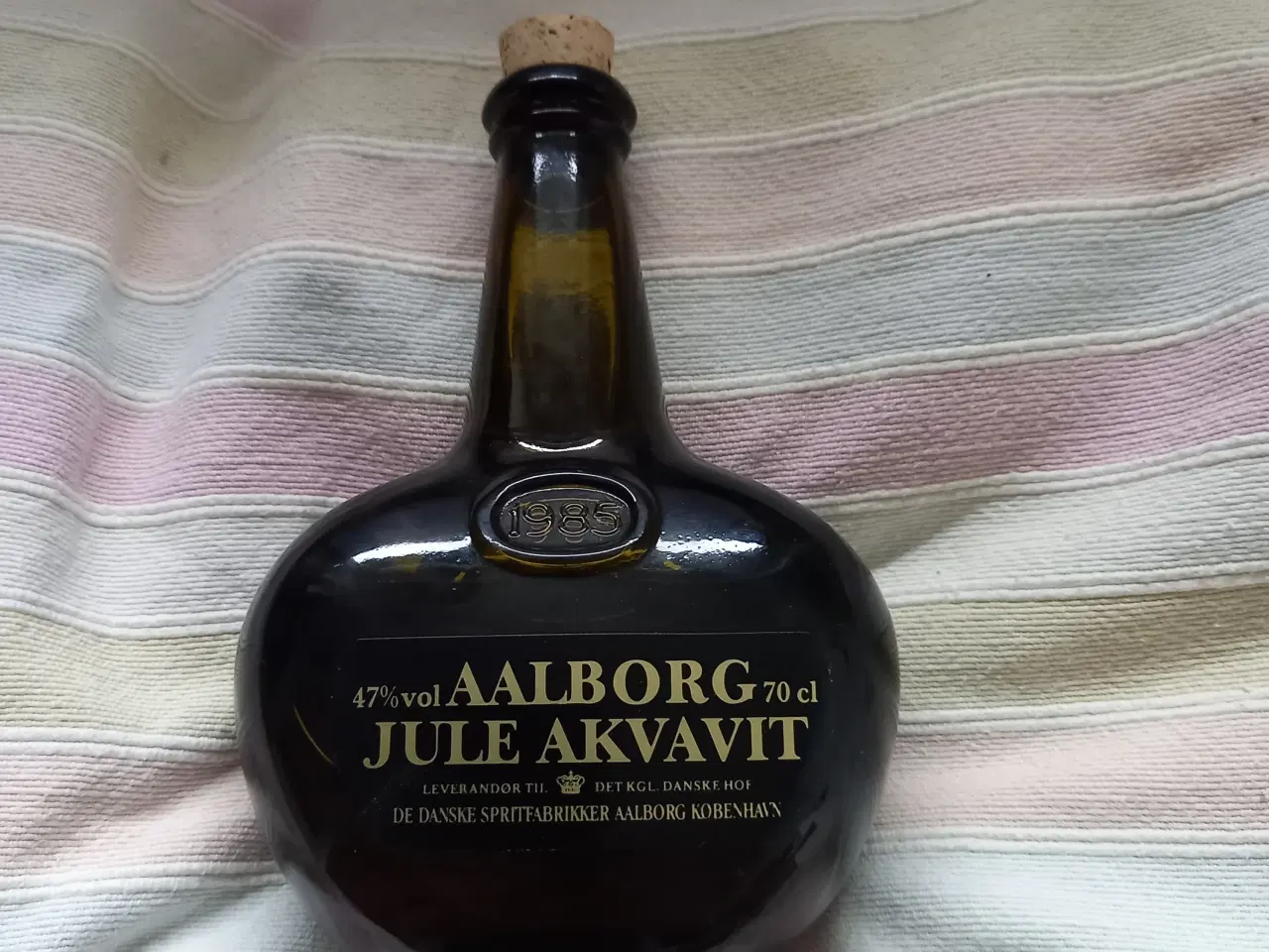 Ålborg jule juleakvavit fra 1985. Med banderole og æske.