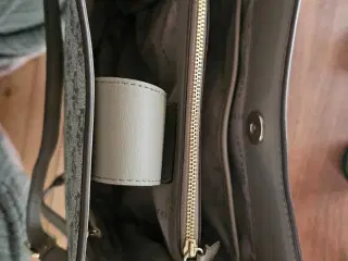 Cremefarvet taske Cremefarvet taske med et mønster af blomster i forskellige nuancer af rød og orange. Tasken har en justerbar skulderrem og en lille læder tag
