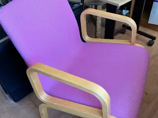 Blå stof med et begyndende slidhul i højre side af sædet, se billederne. Stof er rent og fra ikke-ryger hjem. Ryglæn kan justeres frem og tilbage. Siddehøjde er fast 53 cm. og kan ikke justeres. Stolen har vippefunktion, som ikke kan låses.