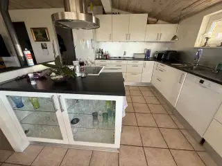 Stort set komplet hvidt UTRUSTA køkken fra IKEA sælges. Det er anskaffet i 2019, og i ret pæn stand. Der er 2x80 cm skuffer, 2x60 cm skuffer (heraf en under vask), 2x40 cm elementer hvoraf et har udtræk, samt 1x60 cm skuffer og overskabe i forbindelse med indbygningsovn. Den sorte bordplade er 3.85 m og træpladen et 30 cm. Soklen er 7.5 cm. Den er bare klikket på benene. Der medfølger også et hvidt Gorenje køle/fryseskab, en sort indbygningsovn fra Blomberg, næsten ny 60 cm Elektrolux induktionskogeplade 60 cm, en sort emhætte 60 cm, en hvid Blomberg opvaskemaskine, håndvask og sort bordplade. Det eneste, der ikke medfølger på billederne er Qooker'eren. Du skal selv afmontere køkkenet og bære det ud.