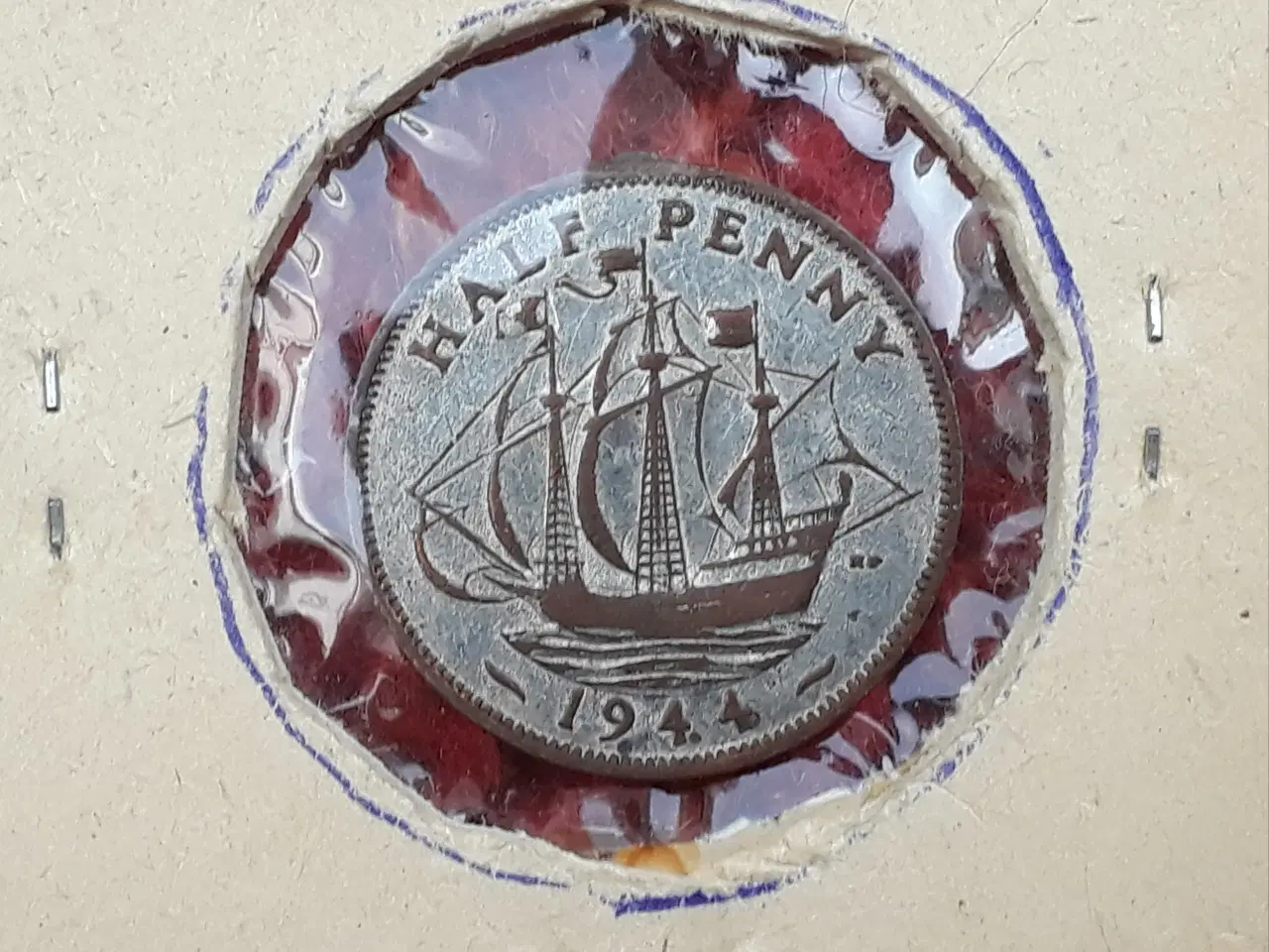 Half Penny United Kingdom Mønt fra 1944 sælges. Fast pris. Stand fremgår af billederne. Georgivs VI G. Br. Half Penny. Sendes gerne for købers regning. 1/2 Øre, England, Great Britain, 3 mastede bagskib, Engelsk, UK Mønt, King George 6., Udenlandsk Mønt, English Coin