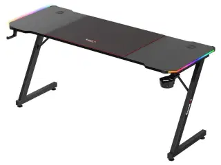 FORDELE VED GAMINGBORD Huzaro Hero 5.0 er et stilrent og funktionelt gamingbord til dig, der vil have styr på udstyret – både til spil og hjemmekontor. Den rektangulære bordplade i carbonfiber-look giver et moderne udtryk og en behagelig overflade til mus og tastatur, mens den stabile aluminiumsramme i sort sørger for et solidt setup. To kabelgennemføringer og indbygget kabelstyring hjælper dig med at holde en ryddelig og fokuseret spilleplads. DESIGNET TIL UDSTYR OG ORDEN Bordet har en lige type med praktiske detaljer som indbygget hovedtelefonkrog og justerbare fødder, så du kan finindstille højden på ujævne gulve. En forhøjet hylde giver ekstra plads til skærm eller tilbehør, og de synlige holdere i metal i siderne gør det nemt at placere kop eller controllers, så alt er lige ved hånden.