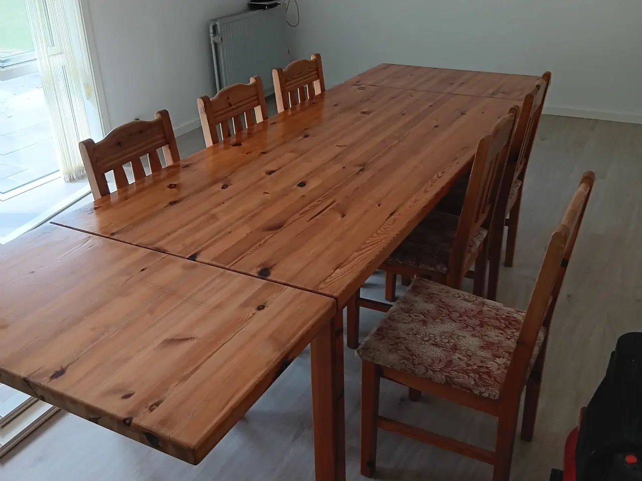 Ups sommerhuset skifter stil :-) Sælger hermed et fyrtræsbord på 180*90 cm med mulighed for at udvide bordet med yderlig en meter med to tillægsplader. Så bordet får en længde på 280*90 cm. Dette gør, at med kan sidde minimum 12 personer og op til 14 personer ved bordet. Der medfølger 6 stole i prisen. Bordet og stolene er ok stand. Dog har det sine brugsspor/patina, men man kan jo bruge en dug til bordet, og man lidt fingersnild, kan stolene betrækkes om. Hvis man ikke kan holde synet ud af det betræk der er på d.d. :-) Bordet og stolene skal naturligvis afhentet :-)