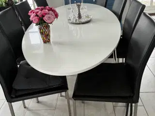 Fyrtræsbord med to tillægsplader samt 6 stole