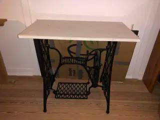 Specielt sybord med en skuffe med tre små rum med låg til småting. Desuden er der en dybere skuffe inde under bordet. Bordpladen er i sig selv dekorativ, trods et par småskader på fineren. (Se billede 2) Bordet er 55 cm bredt, 40 dyb og 72 cm høj.