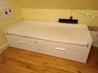 Meget velholdt seng med madras og to skuffer. 80x200 cm. Kan trækkes ud så den bliver 160 cm bred.