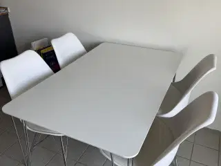 Fint og velholdt spisebord med udtræk med en original massiv tillægsplade + en købt i et byggemarked i alt 280 cm Bordet er composit der følger en halv flaske Ansacore Composit Care med Kan slibes let meget, nem at holde ingen brugsspor eller pletter Der kan sidde 12 personer Hentes I skal selv skrue benene af
