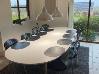 Solidt lækker egetræsbord med sorte granitplader, der medfølger 2 plader til på 45 cm bred stk. Bordet kan derfor blive 270 cm langt, kan sidde 14 ved bordet inkl enderne. Bordet var meget dyrt som nyt, sælges pga ombygning og der er en mindre skjold på bordet, som jeg ikke ved om kan fjernes, men ellers kan det jo fint bruges med en dug eller ved at ligge dækkeservietter på. Bordet er uden stole og lysestage. Stolene er næsten nye, men kan købes særskilt til 500 kr stk, hvis interesse. Kan hentes 31/1.