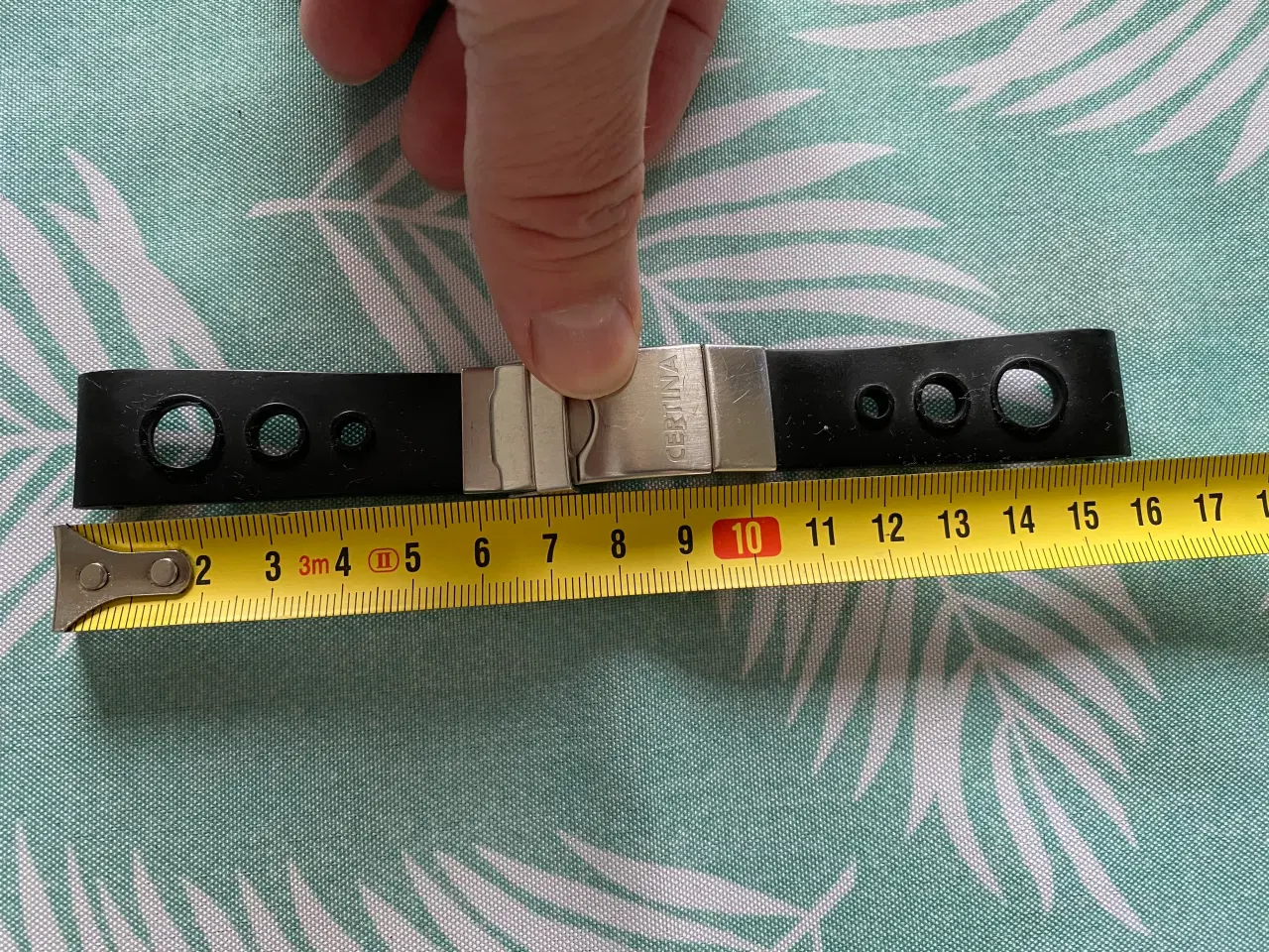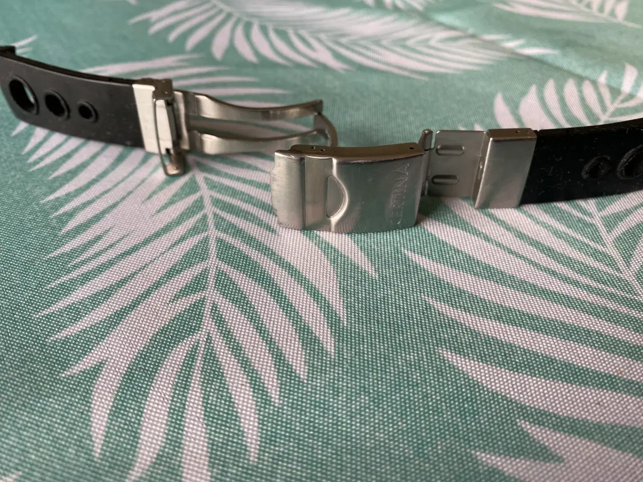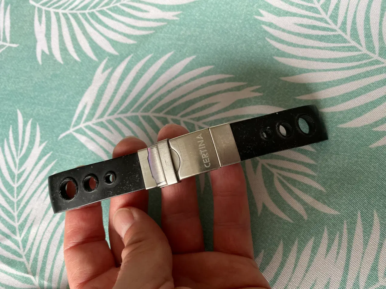 Certina nr.: C016417A BE. Brugt. Original, vandtæt sportsrem i gummi. Se alle billeder for remmens stand (5/10). Farve - sort. Bredde ved spænderne: 20 mm. Spænde: 18 mm. Perfekt til hverdagsbrug og sport, nem at åbne og lukke. Lås i rustfrit stål, justerbar. Remlængde med spænde - 16 cm. Kan forlænges til 18 cm (se billeder). En anden gummirem, designet til spændet, kan også bruges. Forsendelse: - GLS pakkeshop med tracknr. Se mine andre spændende annoncer .. ------------------------------------------------------------ Seriøse henvendelser besvares omgående, og sender normalt hver dag.