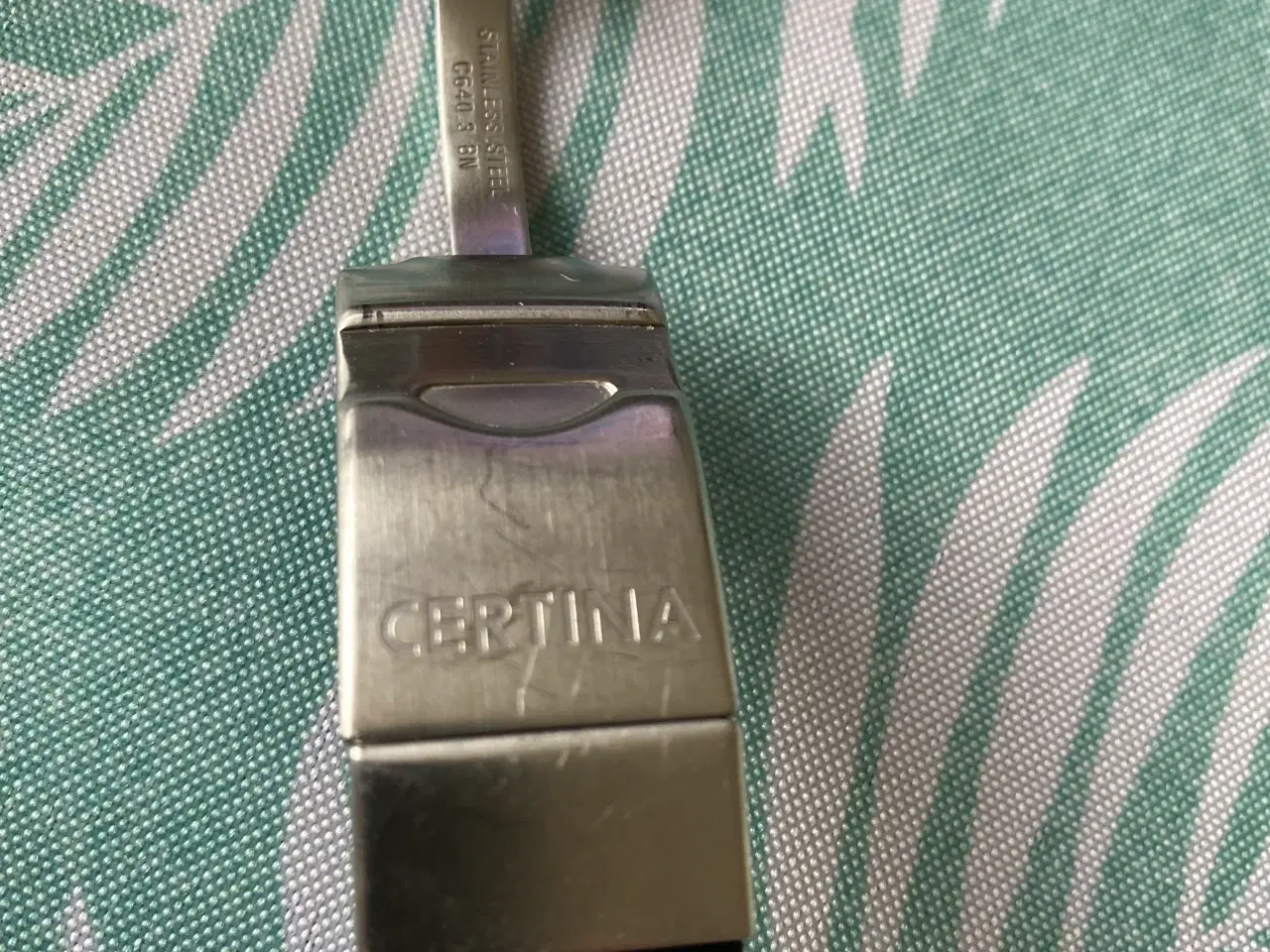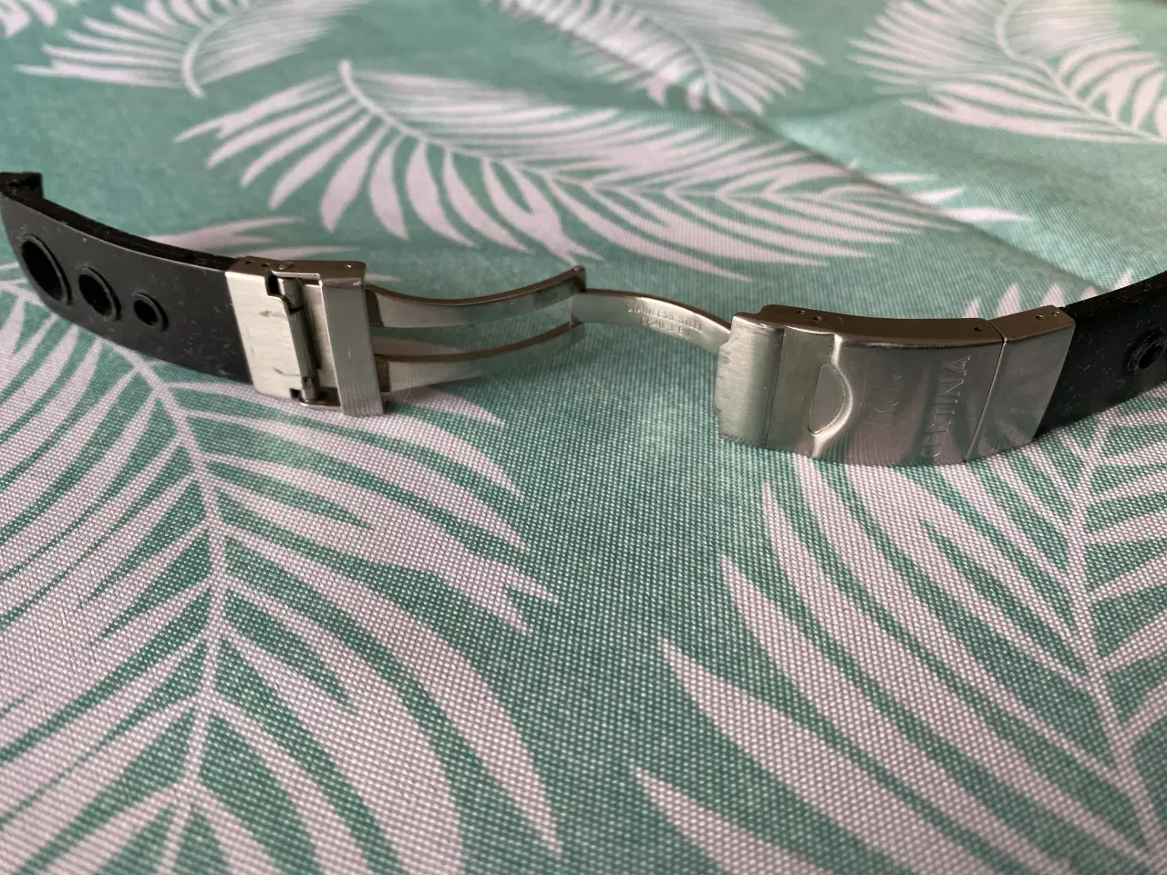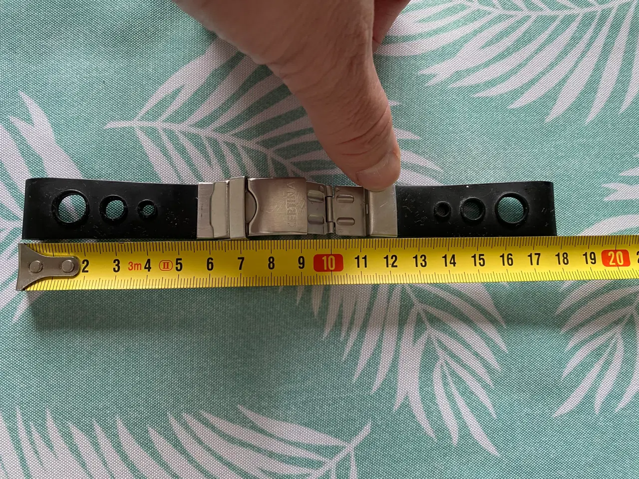 Certina nr.: C016417A BE. Brugt. Original, vandtæt sportsrem i gummi. Se alle billeder for remmens stand (5/10). Farve - sort. Bredde ved spænderne: 20 mm. Spænde: 18 mm. Perfekt til hverdagsbrug og sport, nem at åbne og lukke. Lås i rustfrit stål, justerbar. Remlængde med spænde - 16 cm. Kan forlænges til 18 cm (se billeder). En anden gummirem, designet til spændet, kan også bruges. Forsendelse: - GLS pakkeshop med tracknr. Se mine andre spændende annoncer .. ------------------------------------------------------------ Seriøse henvendelser besvares omgående, og sender normalt hver dag.