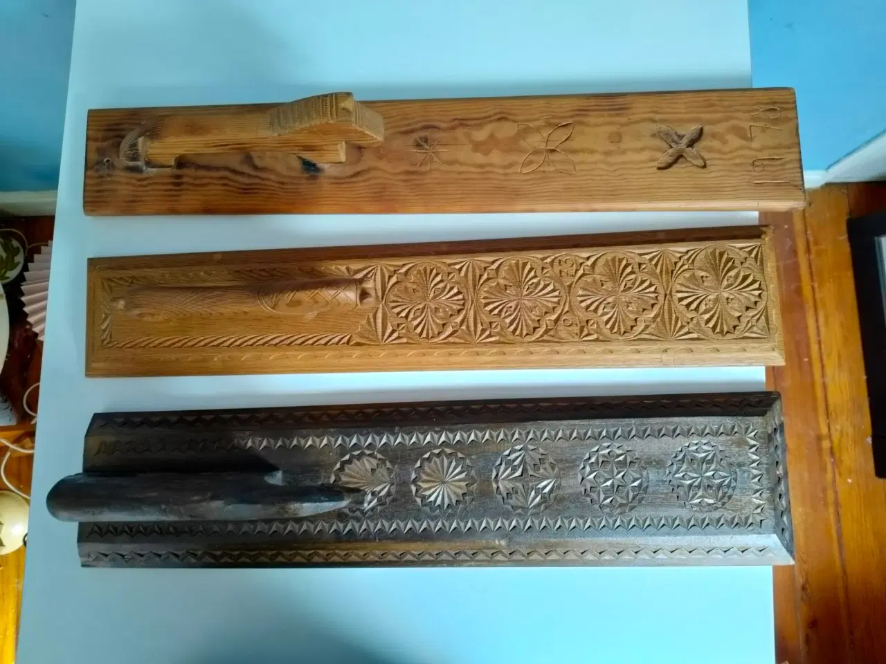 3 smukke manglebrætter fra 1970’erne – dekorative og unikke Sælger tre flotte manglebrætter i træ, dateret til 1973, 1974 og 1978. Alle har fine udskæringer og håndtag – perfekte som vægpynt, gaveidé eller til samlere af dansk håndværk. 🔹 Længder: 61 cm, 63 cm og 65,5 cm 🔹 God stand og smukt håndværk 💰 Pris: 100 kr. pr. stk. eller 200 kr. samlet – kom gerne med bud.