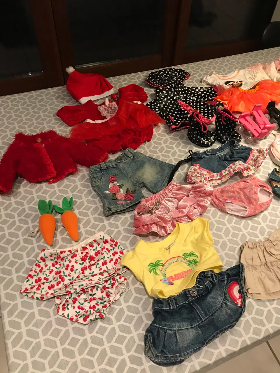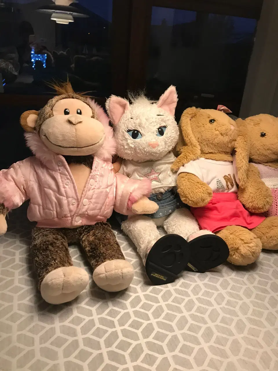 5 bamser (4 Build a Bear) med diverse tøj og sko mm. Fra dyre-/røgfrit hjem.