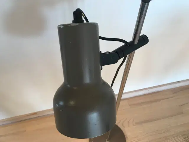 Der er her tale om en retro standerlampe / gulvlampe produceret i mørk grålig-lakeret metal og chrome. Skærmen kan justere i både højde og vinkel således det er muligt at rette lyskilderne lige hvor man ønsker. Måler ca. 95cm i højden og 22cm i diameter på foden Selve skærmene måler L20cm D11cm Lampen har patina der giver den den helt rigtige udtryk til indretningen (se billederne) Ps: se også mine andre annoncer med lamper!