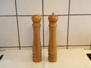 Fransk genre salt og pebersæt fra 1950erne. Bemalet porcelæn, lille tyk mand og kone med rejsetasker. Højde 9 cm., ikke mærket.
