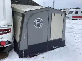 Fritstående fortelt passer til autocampere med en højde på mellem 240 og 270 cm. Mål 300 x 205. Meget lidt brugt. MEGET billigt. Med stålstænger, gardiner m.m.