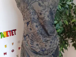 A38. Kortærmet kjole med V-udskæring og et blomstret mønster i hvid, blå og sort på en brun baggrund. Kjolen har en flatterende pasform og har lynlås i siden. og er velegnet til forskellige lejligheder. Er i 80% polyester. 17% viskose og 3% elastane Lining 100% polyester Bryst 90cm Taljen 80cm Hoften 94cm Sender med dao GLS eller bring. Se også al det andet tøj jeg har til salg.